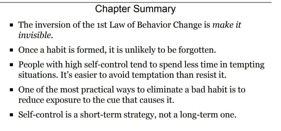 Here’s the punch line: You can break a habit, but you’re unlikely to forget it. Once the mental grooves of habit have been carved into your brain, they are nearly impossible to remove entirely—even if they go unused for quite a while. And that means that simply resisting temptation is an ineffective strategy. It is hard to maintain a Zen attitude in a life filled with interruptions. It takes too much energy. In the short-run, you can choose to overpower temptation. In the longrun, we become a product of the environment that we live in. To put it bluntly, I have never seen someone consistently stick to positive habits in a negative environment.